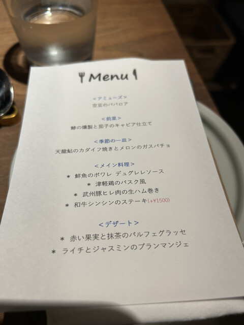 6千円のコースをお願いしました。メインは1品ですが、前菜などいろいろあって、十分満足しました。お料理は全て美味しく、ワインの種類が多く、お店の方がアドバイスしてくれました。