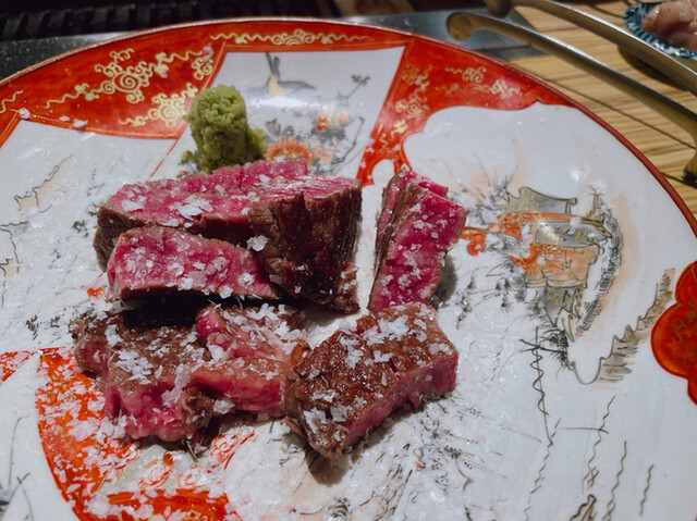 続いて近江牛タンキャビア添え、、人生初です。無知で何も語れませんが、下味ほとんどなしのタンをキャビアの塩っけでいただくこの流れは、普段塩で食べるタンからは味わえない、肉の旨味を尊重した控えめな塩分につぶつぶとした食感がいいのではないでしょうか。