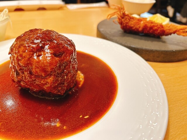 爆弾ハンバーグが1000円で安いので有頭エビフライもつけちゃいました。