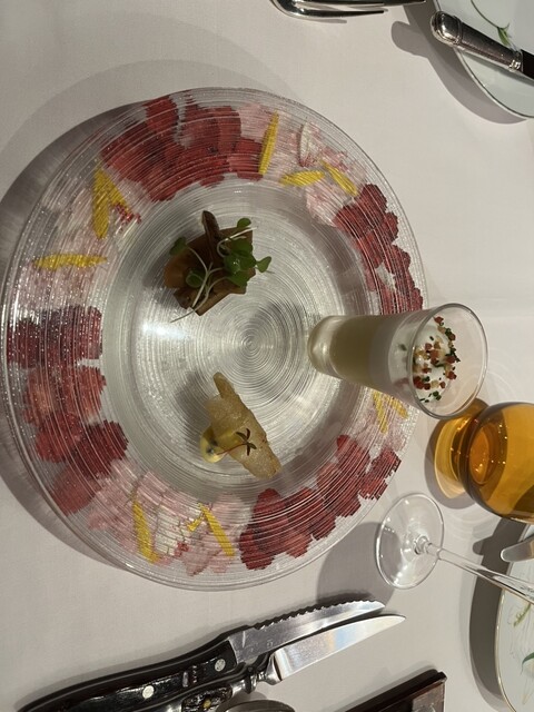 アミューズは生花を使われていて、同じお皿は無いということで、その美しさに感激しました。前菜2皿とも美しく、2皿目のラビオリは、アメリケーヌカプチーノソースと松茸の香りにはほっこりしました。