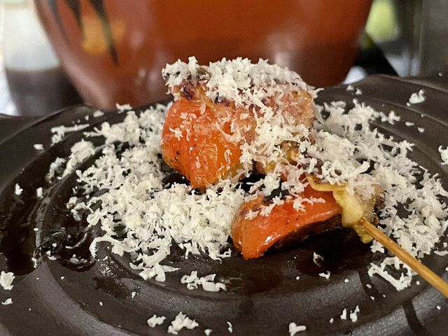 鶏ハラミ+長野アメーラトマト+山形蔵王モッツァレラチーズで、目の前でチーズを振りかけてくれます。