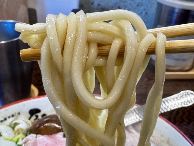 合わさる麺はもちっとした中太麺、どことなく沖縄そばをイメージしちゃいました。卓上にトウガラシ酢もあるし。