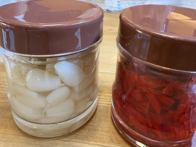 まずは中盛りライスの周りにらっきょうを並べて、ライス中央部を凹ませてセット完了。中央の窪み(カルデラ)に溶岩を注いで実食開始となります。