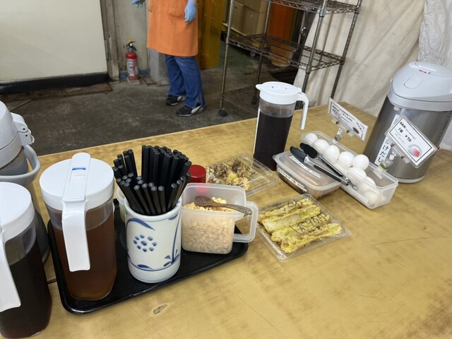 席の前には天ぷらや卵などが置いてあり、お会計は自己申告制。