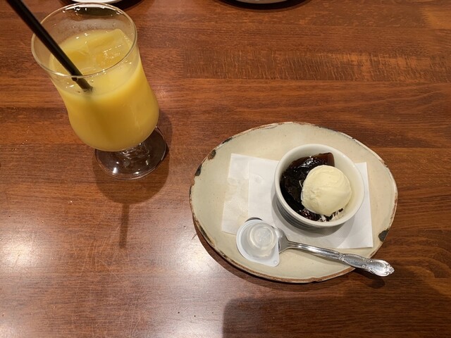 デザートはコーヒーゼリーにアイスクリームとオレンジジュースをチョイス。