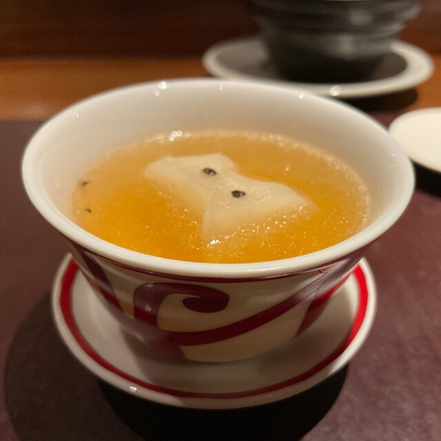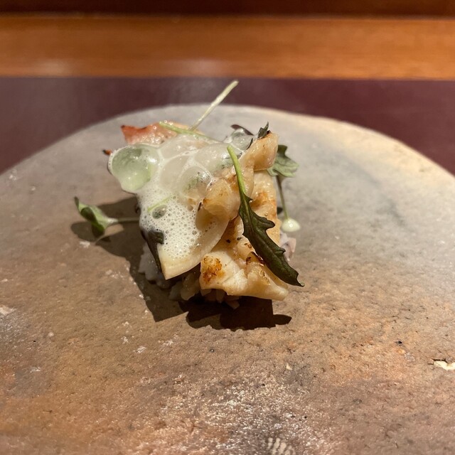 ほっき貝 れんこん 生ハムと青のりのスープを泡に