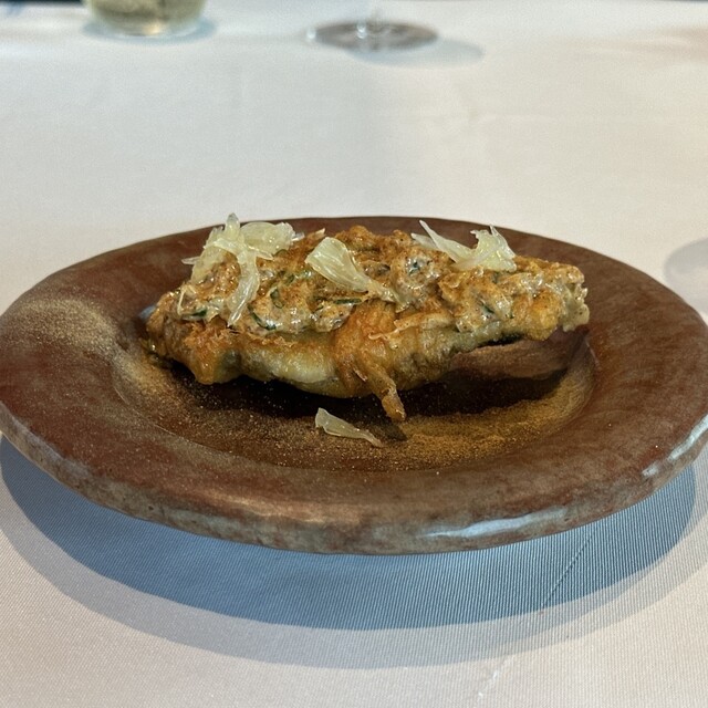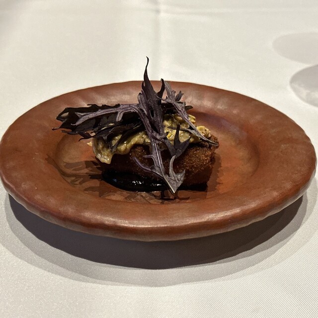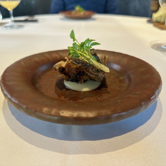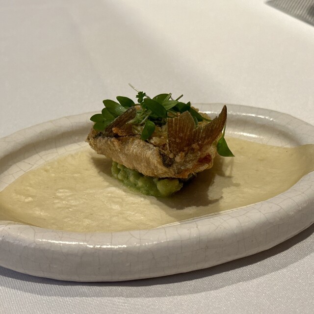 f イワナのフリット 発酵キャベツのソース 大葉 文旦