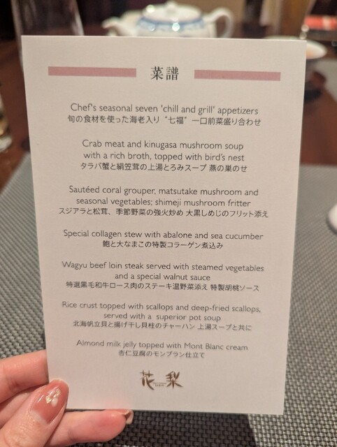 ランチコースを頂きました。個人的にANAインターコンチネンタルホテルのレストランが大好きです。ここ花梨もとても美味しく、毎回楽しみです。このコースは、燕の巣スープと鮑がメインでしょうか。程よい味付けと鮑の食感がよかったです。