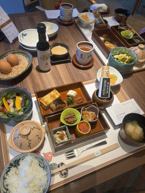 朝食は和食と洋食が選べたので、私は洋食、同行者は和食にして両方楽しみました。洋食のパンはふわふわ、オムレツも絶品。和食はご飯のお供が豊富で、わらに入った本格的な納豆が特に美味しかったです。