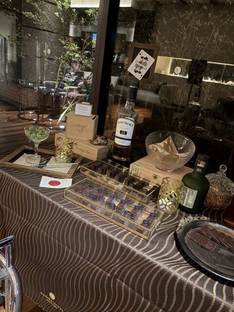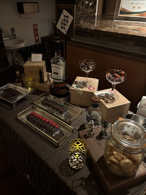 食後には、金谷ホテルの名物であるチョコレートを楽しみました。好きな種類を選べるので、全種類をいただきました。お供のボウモア12年との組み合わせが最高でした。