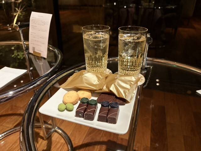 限定ワインはボトルデザインが個性的で、味はまろやかで飲みやすいタイプ。食後には金谷ホテル伝統のチョコレートが提供され、最後まで上質な余韻が残ります。