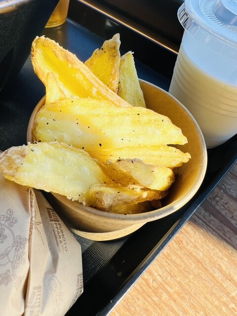 ポテトも独特な形をしていて美味しいです。スパイラルのフライドポテトのようなザクザク感があります。味付けの調味料は売店でも売ってます。