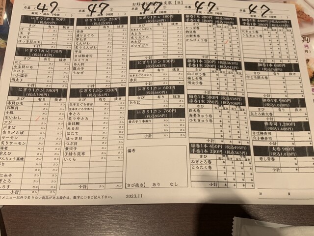 ゲソと真あじ、そしてかんぴょう巻きを追加注文した。単品握りは自分で伝票に書くシステムらしい。