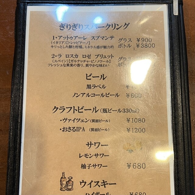 ネット予約枠が埋まっていましたが、前日に電話で確認したところカウンターが2席のみ空いているとのこと。実際座ってみるとオープンキッチンが目の前で、手際良いお仕事を見ながら飲めて最高の席でした。次々入るオーダーをほぼ2人で回していて素晴らしいです。