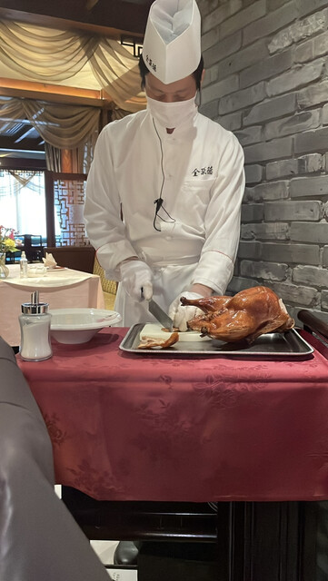 友人に招待されて、宮廷風の有名な北京ダックのお店に行ってきました。ワクワクしながら楽しみにしていたのですが、個室で料理が一品ずつ丁寧に運ばれ、まさに宮廷の宴のようでした。お昼のコースはコスパも良く、雰囲気も素晴らしかったです。前菜は繊細で爽やか、口に入れた瞬間に驚きがありました。