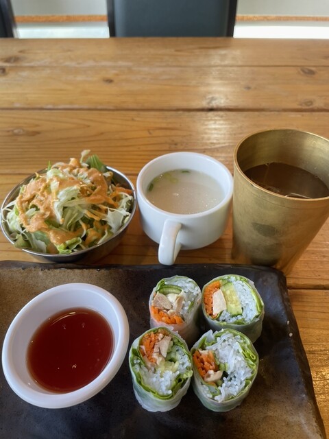直ぐにサラダ、スープ、ドリンク、生春巻き提供された。