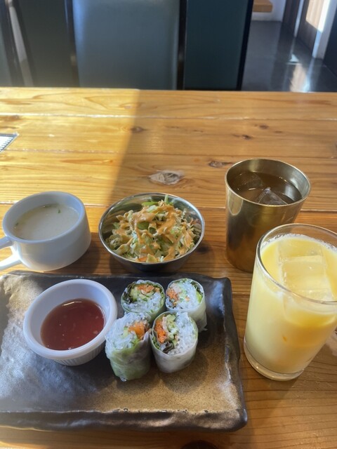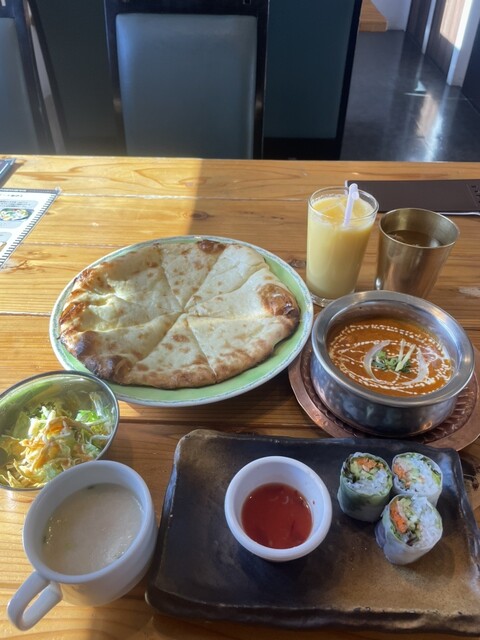 サラダ、スープ、マンゴーラッシー、生春巻き、