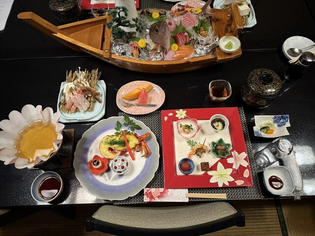 ️おすすめ料理:紅光コース 鮑やサザエも含む舟盛り、金目鯛の煮付け、伊勢海老グラタン、朝食は伊勢海老味噌汁が絶品