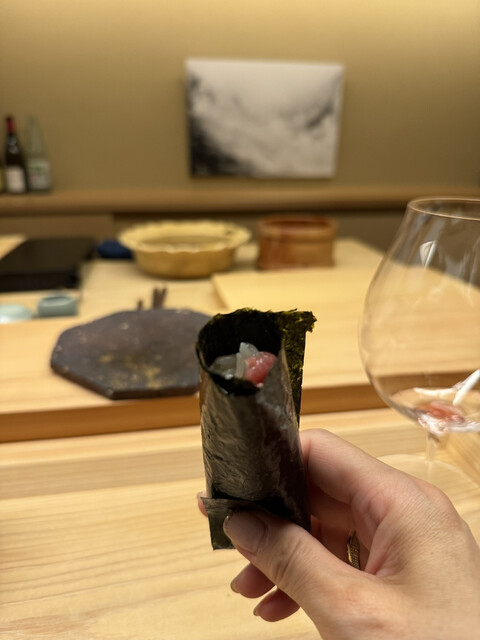 見た目のインパクトとは裏腹に、漬けによる余計な塩味はなく、魚卵の旨みそのものが際立つ。海苔に負けないすじこの風味が口の中にふわりと広がり、数秒で消えていく儚い美味。