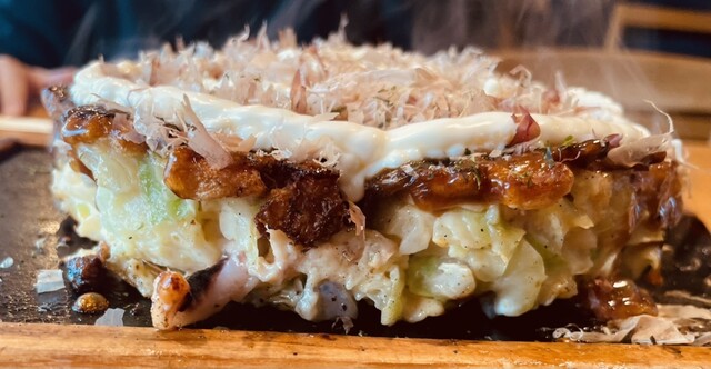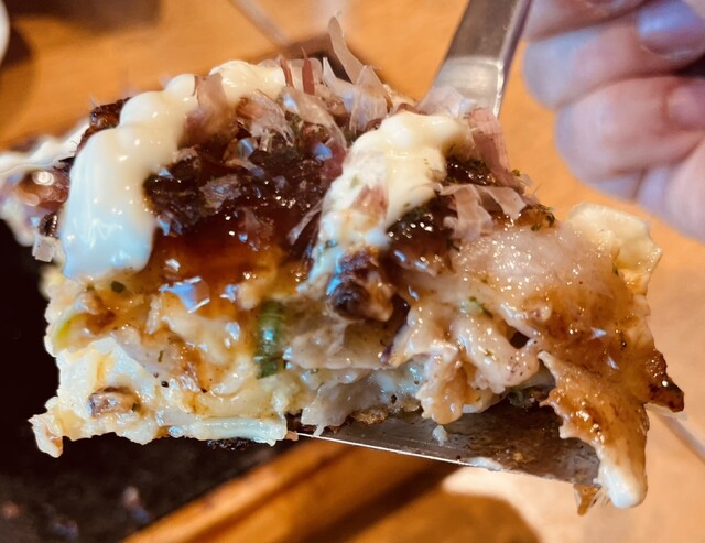 最後に、お好み焼き ブタイカが到着、ふわふわ具合と厚みが凄い!! 薄力粉とだし汁と山芋で作られる生地とキャベツと空気の含有量が絶妙なのでしょう。焼き加減、そしてソースとマヨネーズ、仕上げの青のり、かつお節等が絡んで申し分のない味が完成される。