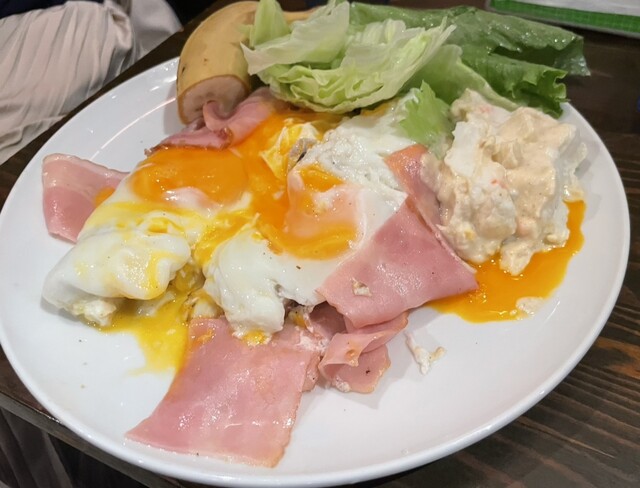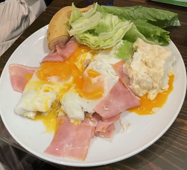 まずお客様の半分が外国の方。アジア系、欧米系とバランスよくいらっしゃいました。私の相席こ方も欧米系の方で日本語が堪能。お話しを伺うと2日連続でモーニングを食べにきてる若者。メニューにない商品がテーブルに並んでいることから店主のおばちゃんのサービスだと思われます。