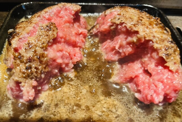 そして少し遅れてメインの和牛100%のレアハンバーグが登場!! 四角いステーキ皿に乗せられて、焼肉ロースターの上に置かれます。すでにロースターは点火されているので、レアハンバーグに少しづつ焼きが入っていきます。そのまま好きなタイミングで食べることを想像していましたが、レアハンバーグの上からソースのような出汁が並々注がれました。