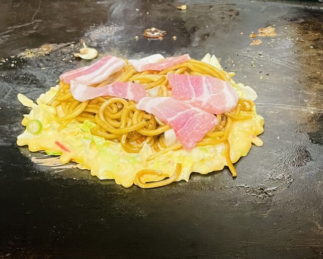 豚ミックス玉にそばをトッピングしたモダン焼きを注文(税込1,300円+150円)