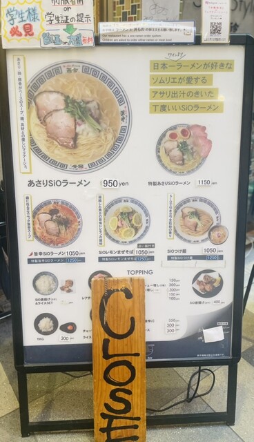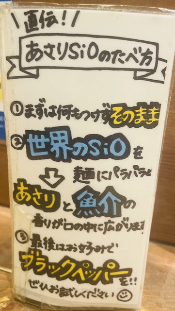 一番人気だと思われる「特製あさりsio(税込み1,150円)」を注文し、待っている間に、あさりsioのたべ方なるポップがあり、世界のsioとブラックペッパーで2度、味変することを学びました。