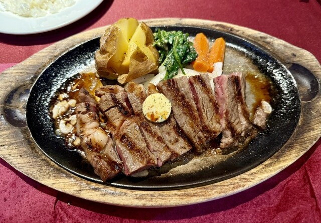 佐賀牛のロース150gをいただきました。ステーキの焼き加減が最高でした。産地による牛の味の違いは私にはわかりませんが、赤みとサシのバランスがちょうどよく、火加減が絶妙で、余分な脂は落ちていて脂も柔すぎないように少し硬めに火を通していました。赤身の部分もちょうど口に入れて柔らかく噛めます。断面は確かに赤いんですけどしっかり火が通っていて、店員さんの言った通り焼き加減はお任せか良いです。