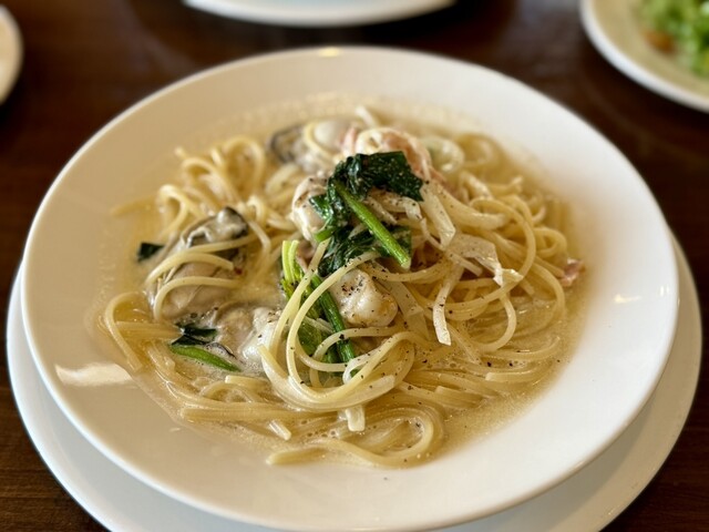 私が注文したメインの牡蠣のクリームパスタは牡蠣の旨みがしっかりクリームの中にも出ていてパスタをソースに絡めて食べても美味しいですし、そこに更に追い牡蠣をすると、牡蠣の旨みが口いっぱいに広がってウヒョー!!!!となりました。めちゃくちゃ美味しいです!家内が頼んだ渡り蟹のクリームパスタをシェアしてもらい食べましたがこれもトマトソースが蟹の旨みとマッチしてとっても優しい味です。食後にカシスのシャーベットとみるくぷりんんをいただいてコーヒーを飲みながら景色を見てゆっくり。