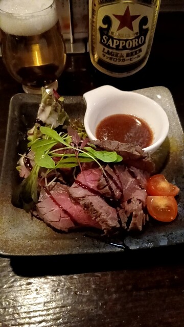 瓶ビール、ハイボール、ルッコラと刺身のサラダハーフ、ローストビーフハーフ、スペアリブのオーブン焼きでした。