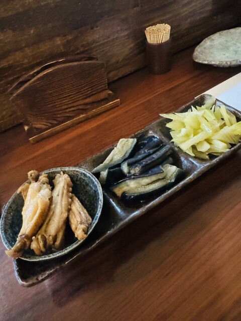 小鉢3種はナスの煮浸し、セロリお浸し、鶏手羽煮。