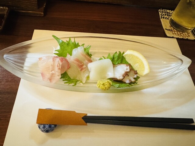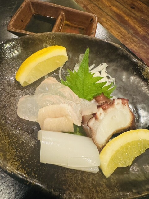 刺身3種盛り、ヒラメ、剣イカ、タコ