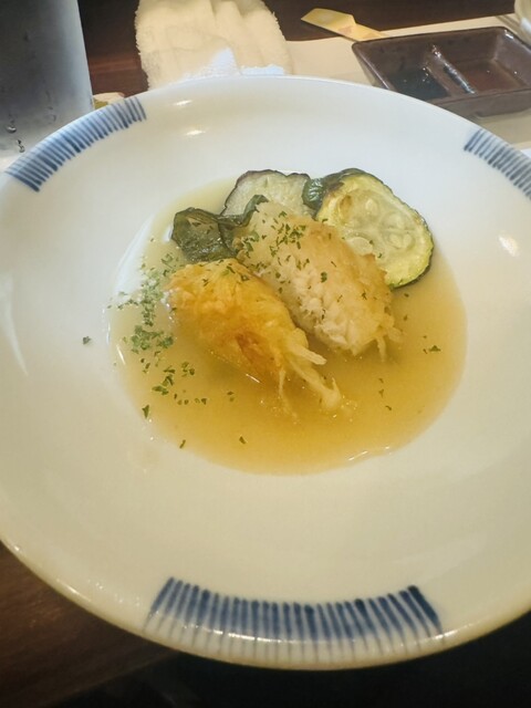 ヒラメ梅しそ天ぷら、水茄子の天ぷら、筍の天ぷらハーフの盛り合わせ