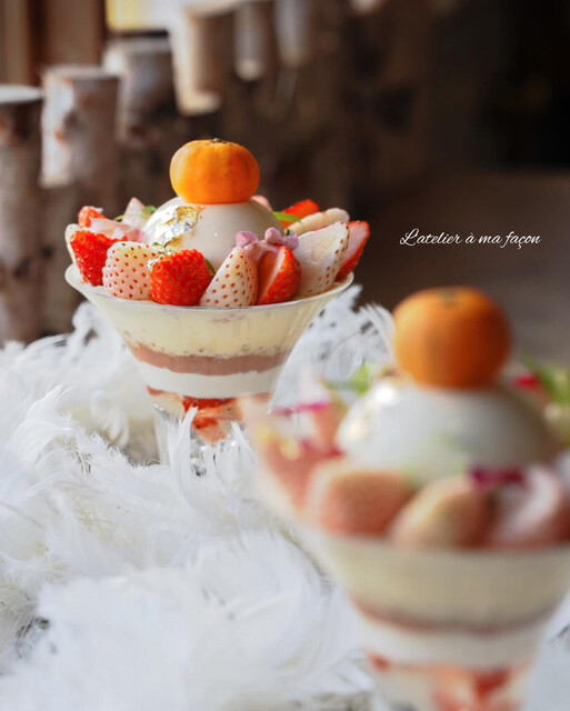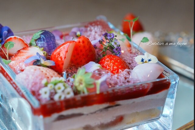 ピンクの淡雪モンブランにメレンゲアイスが美味しいあまおうのグラス
