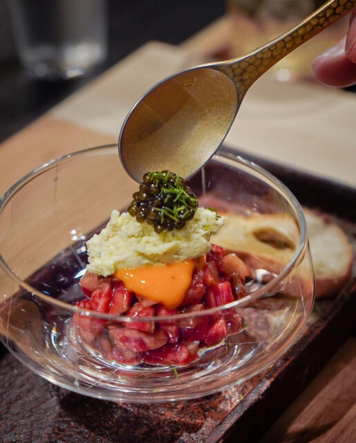 ヘレ肉のタルタルって、今日当たりやない⁉️(๑˃̵ᴗ˂̵)黄身ソースとピスタチオを混ぜたもったりしたクリームにキャビアの塩気が堪らん❤︎