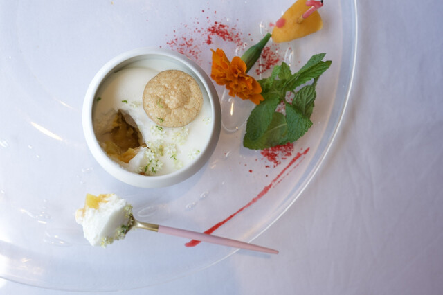 中にキャラメリゼされたパイナップル、ライチ、パッションフルーツが入ってて、甘いココナッツムースのふんわりした口当たりがすごく好き♡
