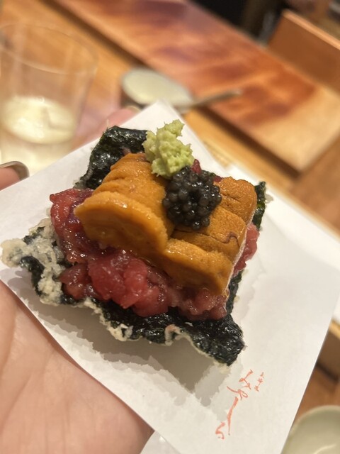ウニは濃厚で、エビは甘く、キャビアの塩味と絶妙なバランス。それらと海苔の香り、パリパリの食感が相待って至高の逸品