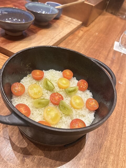 ◯トマトの炊き込みご飯にかき揚げをのせて
