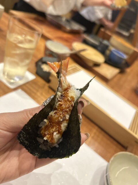 ◎手渡しで海苔に包んだエビの天ぷら
