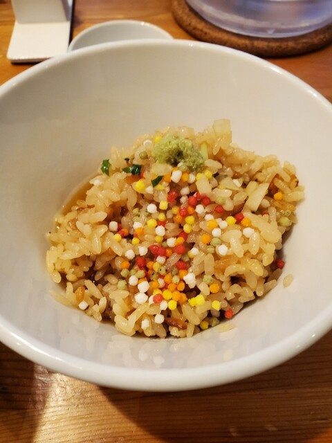 “二ボだしごはん”をつまみながら煮干しそばを食べ進み終わる頃、煮干しそばのスープを二ボだしごはんにかけて添えてあるあられとわさびを投入!お茶漬けにして頂きます。