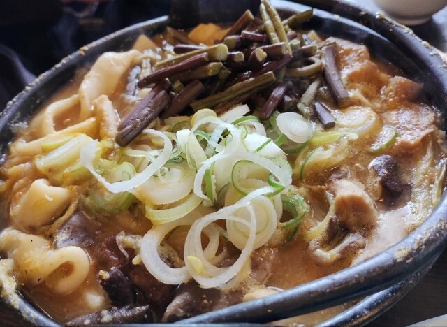 基本的にどのほうとうにもかぼちゃ、白菜、人参、じゃがいも、里芋が入っていて、山菜がトッピングされているみたい。野菜も高騰の折柄、たっぷりいただくことができて大満足。大満腹。