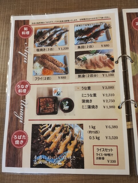 自然に囲まれた森田城のやな。鮎を炭火焼き、田楽、フライと3種の料理で楽しめる鮎三昧定食は、その名の通り鮎のいろんな味を堪能できて良かった。
