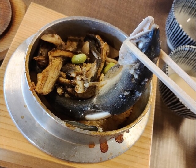 鮎釜めしは尾頭付きで巻き込まれているから、鮎の旨味が全てご飯に染みている。頭と骨の上手な取り方が書いてあるので、その通りにすればキレイにいただける。