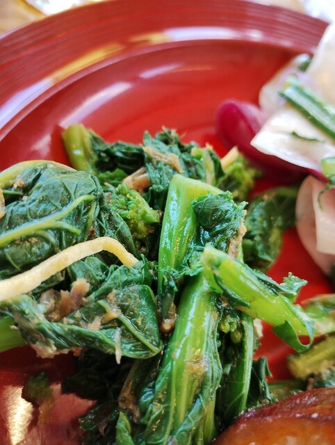 季節感のある菜花のおひたし、カブのサラダ、ピクルスは大根、セロリ、レンコンなど。どの野菜も大切に下ごしらえがされていて美味しかった。