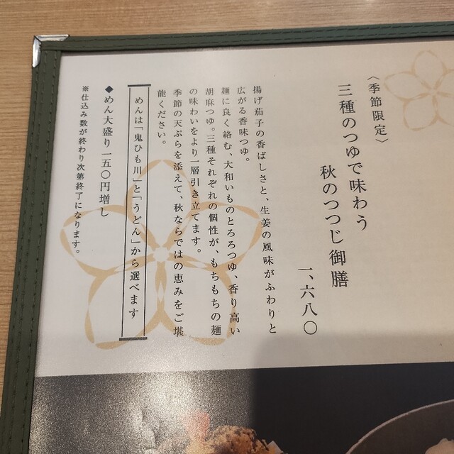 私は秋限定3種のタレ食べ比べのセット、相方は丸ごと玉ねぎのカレーうどん。どちらもうどんはひもかわに変更して、カレーの方は大盛りで注文。