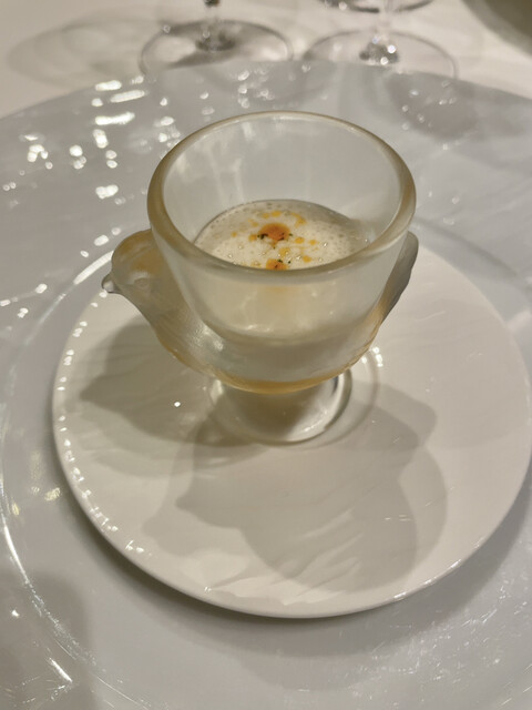 続けてカニのロワイヤルに渡蟹のスープ、ココナッツの泡を添えた温かいスープが出されました。