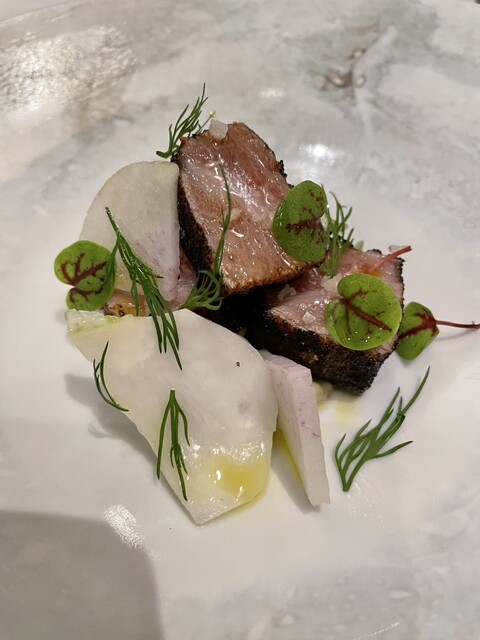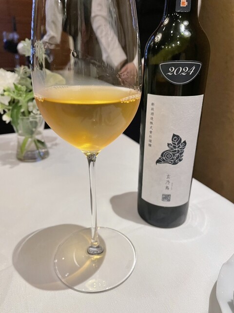 合わせるは新政酒造「玄乃鳥」で、お米のシェリーともいえるような甘美な飲み口が料理と合う。