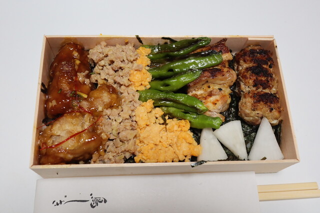 そぼろ、炒り卵、油淋鶏が乗っていて、