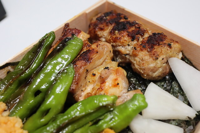 ごはんの上に、つくね、焼鳥、お新香、シシトウ、